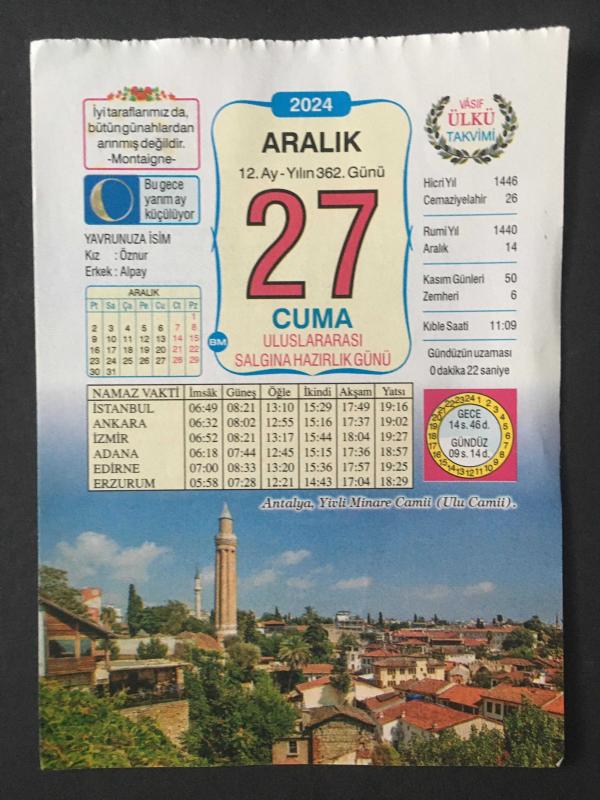 27 ARALIK 2024 -TAKVİM YAPRAĞI-DOĞUM GÜNÜ HEDİYESİ-VASIF ÜLKÜ TAKVİMİ,ANTALYA YİVLİ MİNARE CAMİİ ULU CAMİİ,YAVRUNUZA İSİM,MUHASEBE YAPMAK, AYASOFYA JUSTİNİANOS TARAFINDAN İNŞA EDİLDİ,ATATÜRK VE HEYETİ TEMSİLİYE ANKARAYA GELDİ 1919,TARSUS FRANSIZ İŞGALİNDEN KURTULDU 1921,ABDULMECİD İŞGAL GÜÇLERİNİN POLİSLERİ TARAFINDAN TRAFİK CEZASI ÖDEDİ 1922, ULVİYE MEVLAN 1893-1964,MEYVELİ YOĞURT, 1 yıl önce satışa sunulmuştur.