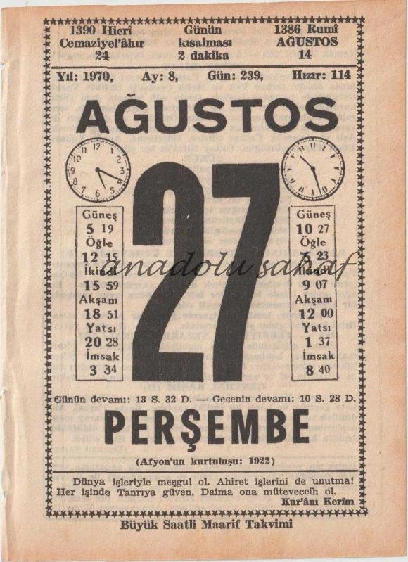 27 Ağustos 1970 / Büyük Saatli Maarif Takvimi