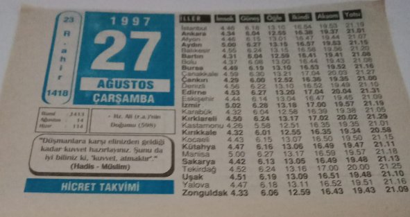 27 Ağustos 1997-Orijinal Takvim Yaprağı-Doğum Günü-Söz,Nişan,Nikâh,Düğün ve Önemli Günler Hediyesi-Hicret Takvimi-Ayet(Hadis)-(Hadis-Müslim)-Hz.Ali(r.a.)'nin Doğumu(598)-Mithat Paşa'nın Ölümü-Siyer'den-Hikmetler, en son 3 gün önce güncellenmiştir.