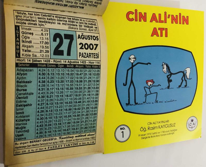 27 Ağustos 2007 hediyelik orijinal Fazilet takvim yaprağı (Cin Ali kitabı hediyeli:), 3 yıl önce satışa sunulmuştur.