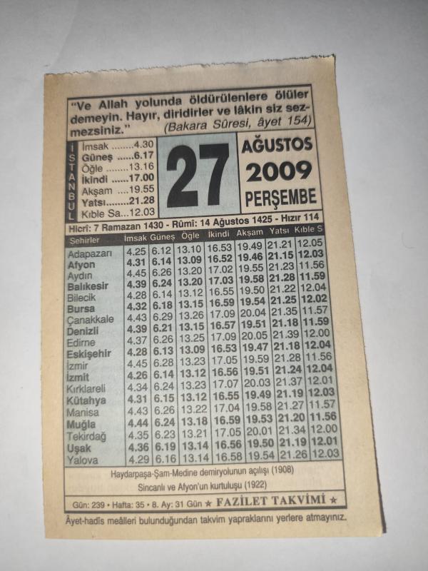 27 Ağustos 2009-Orijinal Takvim Yaprağı-Doğum Günü-Söz,Nişan,Nikâh,Düğün ve Önemli Günler Hediyesi-Fazilet Takvimi-Ayet(Hadis)(Bakara Suresi, ayet 154)-Haydarpaşa-Şam-Medine demiryolun açılışı (1908)-Şehidlerin Fazileti, en son 24 gün önce güncellenmiştir.