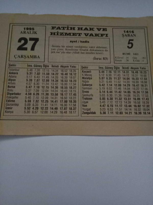 27 Aralık 1995-Orijinal Takvim Yaprağı-Doğum Günü-Söz,Nişan,Nikâh,Düğün ve Önemli Günler Hediyesi-Fatih Hak ve Hizmet Vakfı-Ayet/Hadis(İsra:83)-Mehmed Akif Ersoy-Sözün Özü-Şimdi Bu Moda..., 23 gün önce satışa sunulmuştur.