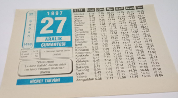 27 Aralık 1997-Orijinal Takvim Yaprağı-Doğum Günü-Söz,Nişan,Nikâh,Düğün ve Önemli Günler Hediyesi-Hicret Takvimi-Ayet(Hadis)(Hadis)-Mehmet Akif'in Vefatı(1936)-Mehmet Akif Ersoy-Hz.Ali(r.a.) Çocukken-Hadis-i Şerif, en son 8 saat önce güncellenmiştir.