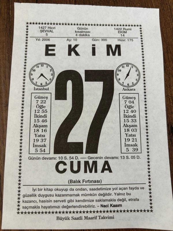27 EKİM 2006 - TAKVİM YAPRAĞI - DOĞUM GÜNÜ HEDİYESİ - BÜYÜK SAATLİ MAARİF TAKVİMİ - NACİ KASIM - MUSTAFA KEMA BULGARİSTAN'A ATEŞE MİLİTER OLARAK - NAPOLEON BERLİN'E GİRDİ - İTALYAN BESTECİ NİCOLLO PAGANİNİ DOĞDU başlıklı ürün, Efemera, Müzik, Sinema > Belge ve Evraklar > Takvimler kategorisi altında İkinci El olarak satılmaktadır.