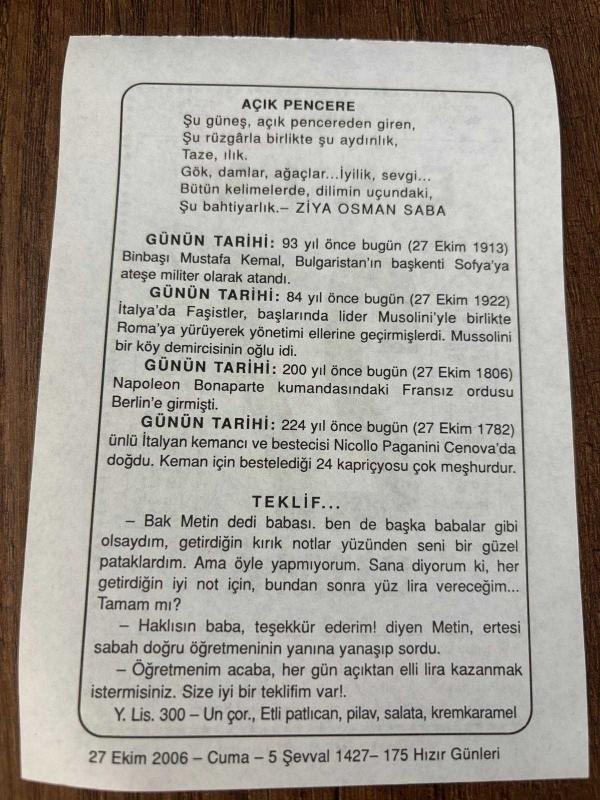 27 EKİM 2006 - TAKVİM YAPRAĞI - DOĞUM GÜNÜ HEDİYESİ - BÜYÜK SAATLİ MAARİF TAKVİMİ - NACİ KASIM - MUSTAFA KEMA BULGARİSTAN'A ATEŞE MİLİTER OLARAK - NAPOLEON BERLİN'E GİRDİ - İTALYAN BESTECİ NİCOLLO PAGANİNİ DOĞDU, en son 8 ay önce güncellenmiştir.