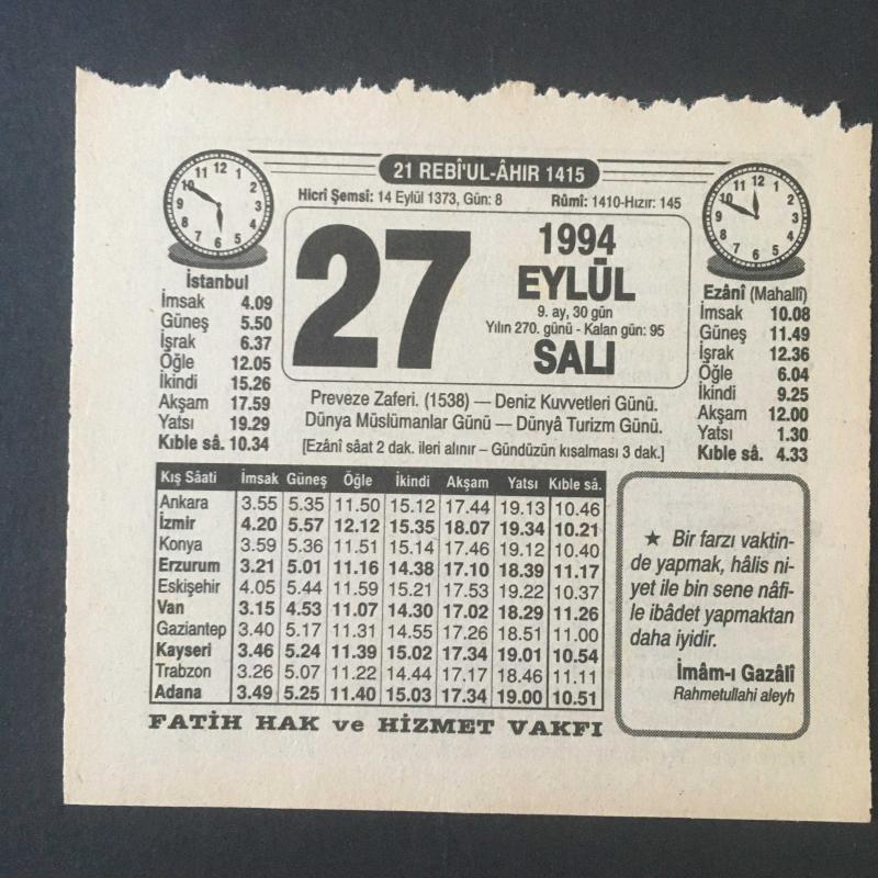 27 EYLÜL 1994 -TAKVİM YAPRAĞI-DOĞUM GÜNÜ HEDİYESİ-FATİH HAK VE HİZMET VAKFI TAKVİMİ,PREVEZE ZAFERİ 1538,DENİZ KUVVETLERİ GÜNÜ,DÜNYA MÜSLÜMANLAR GÜNÜ,DÜNYA TURİZM GÜNÜ, başlıklı ürün, Efemera, Müzik, Sinema > Belge ve Evraklar > Takvimler kategorisi altında İkinci El olarak satılmaktadır.