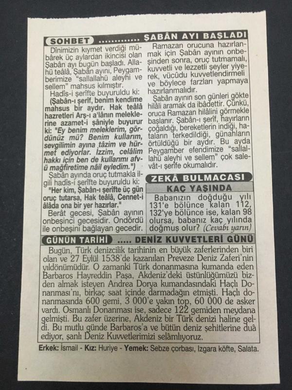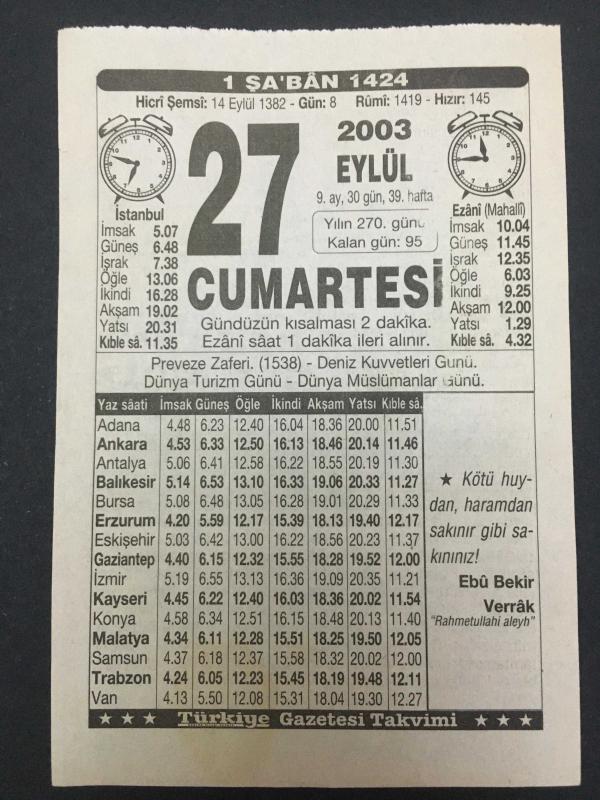 27 EYLÜL 2003-TAKVİM YAPRAĞI-DOĞUM GÜNÜ HEDİYESİ-TÜRKİYE GAZETESİ TAKVİMİ,PREVEZE ZAFERİ 1538,DENİZ KUVVETLERİ GÜNÜ ,DÜNYA TURİZM GÜNÜ,DÜNYA MÜSLÜMANLAR GÜNÜ,ŞABAN AYI BAŞLADI, en son 8 ay önce güncellenmiştir.