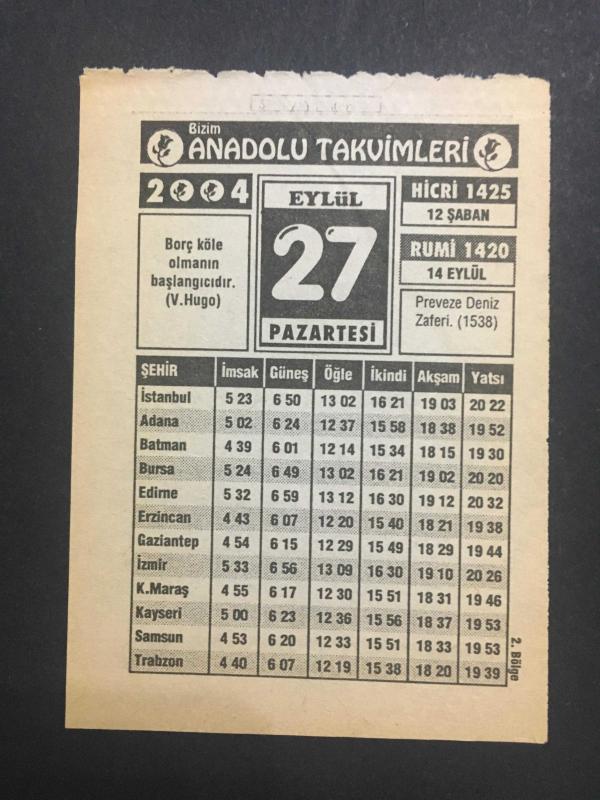27 EYLÜL 2004 -TAKVİM YAPRAĞI-DOĞUM GÜNÜ HEDİYESİ-BİZİM ANADOLU TAKVİMLERİ,PREVEZE DENİZ ZAFERİ 1538,DİLİN AFETLERİ, 1 yıl önce satışa sunulmuştur.