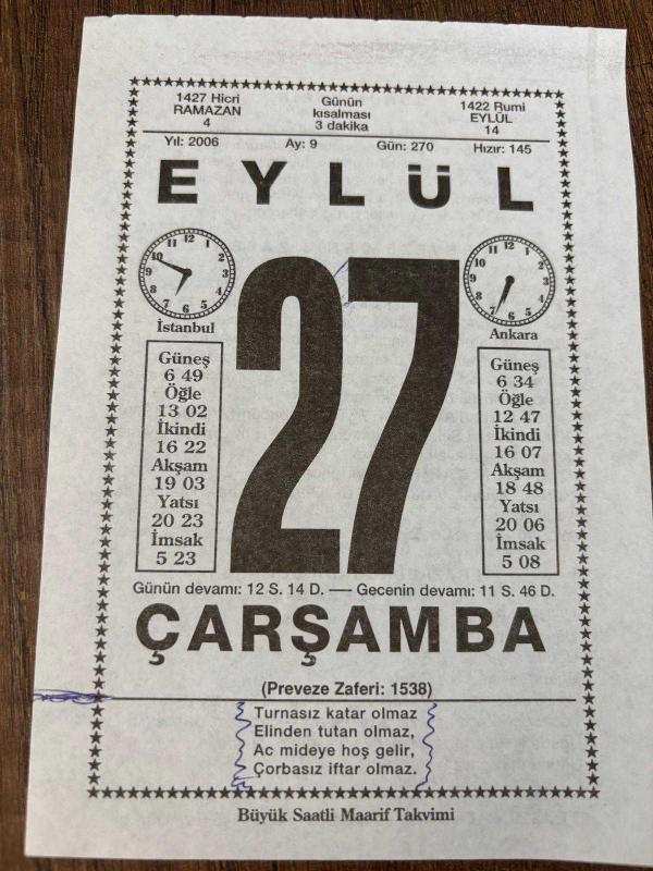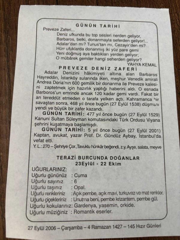 27 EYLÜL 2006 - TAKVİM YAPRAĞI - DOĞUM GÜNÜ HEDİYESİ - BÜYÜK SAATLİ MAARİF TAKVİMİ - YAHYA KEMAL - PREVEZE DENİZ ZAFERİ - KANUNİ SULTAN SÜLEYMAN VİYANAYI KUŞATMAYA BAŞLADI - AVUKAT,YAZAR PROF. DR. GÜNDÜZ AYBAY VEFAT ETTİ, en son 8 ay önce güncellenmiştir.