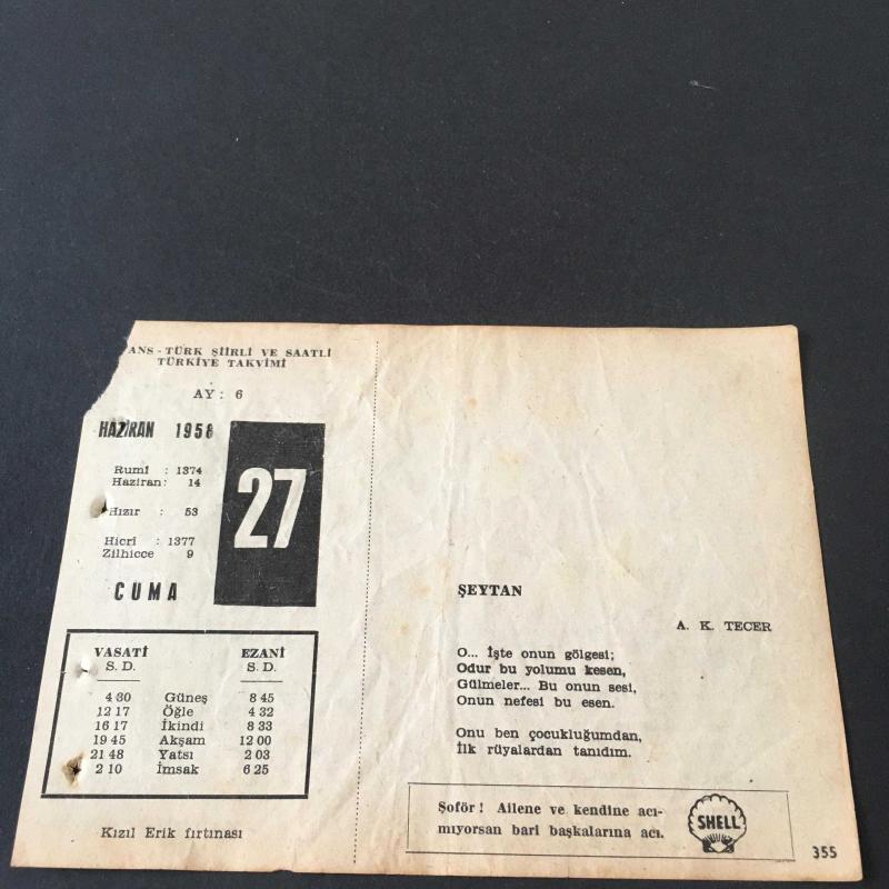 27 HAZİRAN 1958 -TAKVİM YAPRAĞI-DOĞUM GÜNÜ HEDİYESİ-AJANS-TÜRK ŞİİRLİ VE SAATLİ TÜRKİYE TAKVİMİ,A.K.TECER,Y.K.BEYATLI,FAL,FIKRA,TASVİRİ EFKARIN İNTİŞARI 1587,GÜZEL SÖZ,YEMEK LİSTESİ başlıklı ürün, Efemera, Müzik, Sinema > Belge ve Evraklar > Takvimler kategorisi altında İkinci El olarak satılmaktadır.