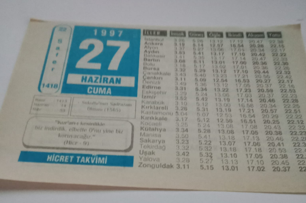 27 Haziran 1997-Orijinal Takvim Yaprağı-Doğum Günü-Söz,Nişan,Nikâh,Düğün ve Önemli Günler Hediyesi-Hicret Takvimi-Ayet(Hadis)-(Hicr 9)-Sokullu'nun Sadrazam Olması(1565)-Hz. Ebu Bekir(r.a.)'in İlk Hutbesi-Soru Cevap-Mevlana, en son 20 gün önce güncellenmiştir.