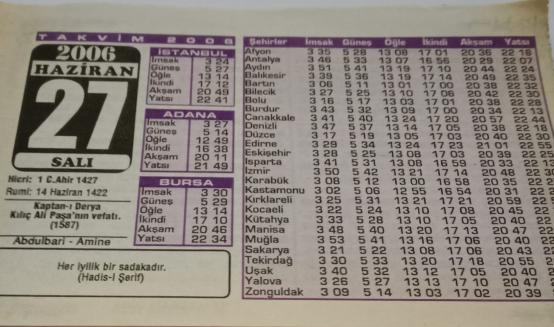 27 Haziran 2006-Orijinal Takvim Yaprağı-Doğum Günü-Söz,Nişan,Nikâh,Düğün ve Önemli Günler Hediyesi-Bizim Anadolu Takvimleri-Ayet-Hadis(Yasin: 31)-(Türkiye, BM anlaşması imzalandı. (1945))-Abdulbaki - Aliye-Kaz Göndersem, en son 2 ay önce güncellenmiştir.