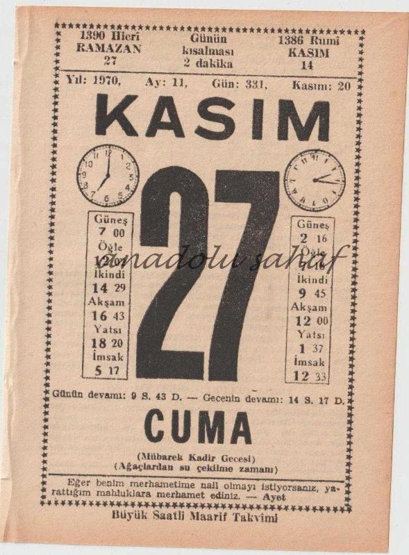 27 Kasım 1970 / Büyük Saatli Maarif Takvimi