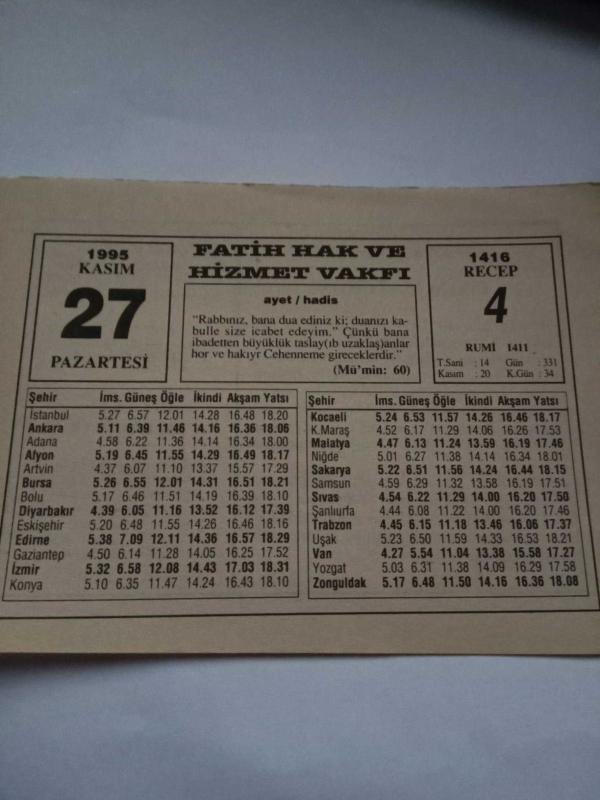 27 Kasım 1995-Orijinal Takvim Yaprağı-Doğum Günü-Söz,Nişan,Nikâh,Düğün ve Önemli Günler Hediyesi-Fatih Hak ve Hizmet Vakfı-Ayet/Hadis(Mü'min:60)-İmam Maturidi-Şakir-i Belhi-Diz Üstü Bilgisayar, en son 4 ay önce güncellenmiştir.