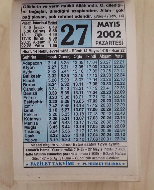 27 MAYIS 2002 PAZARTESİ- TAKVİM YAPRAĞI - DOĞUM GÜNÜ HEDİYESİ - FAZİLET TAKVİMİ -ELMALI'LI HAMDİ YAZIR'IN VEFATI (1942)-27 MAYIS İHTİLALİ (1960)-HAFTA TATİLİNİN CUMADAN PAZARA ALINMASI (1935)-İSTANBUL'UN TESBİH VE TEKBİRLERLE FETHİ, en son 6 ay önce güncellenmiştir.