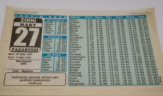 27 Mart 2006-Orijinal Takvim Yaprağı-Doğum Günü-Söz,Nişan,Nikâh,Düğün ve Önemli Günler Hediyesi-Bizim Anadolu Takvimleri-Ayet-Hadis(Hz.Ali(r.a))(Uhud Gazvesi(625))-Edib,Makbule-Stanford, en son 2 ay önce güncellenmiştir.
