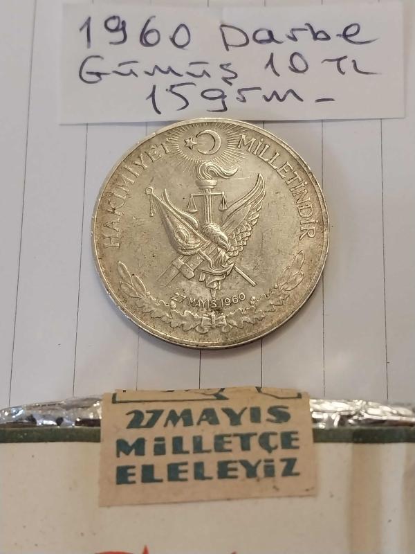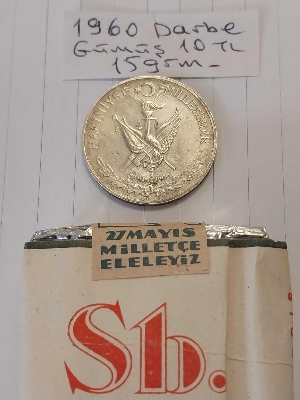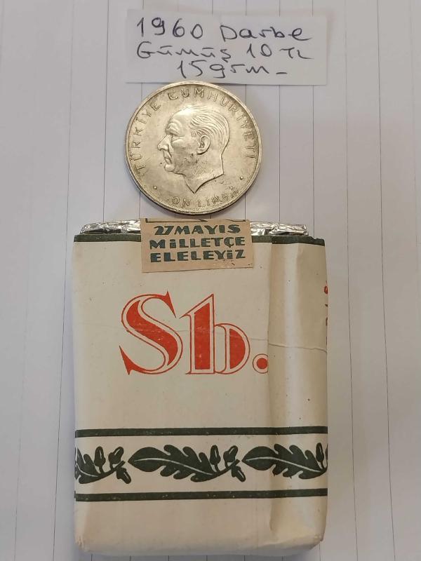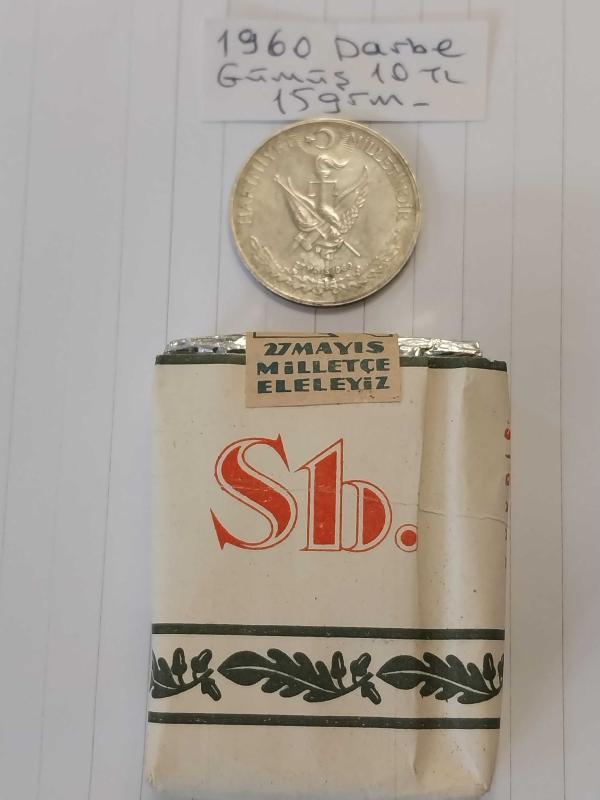 27 Mayıs 1960 DARBE Hatırası Gümüş 10 tl. Ve Subaylara Mahsus 27 Mayıs 1960 Milletle Elele Yazılı Dolu Sigara Paketi. Koleksiyonluk. Para 15 gr. başlıklı antika/koleksiyon objesi Türkiye menşe’lidir. 1960-1979 arası dönemine aittir.