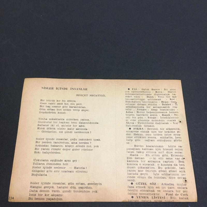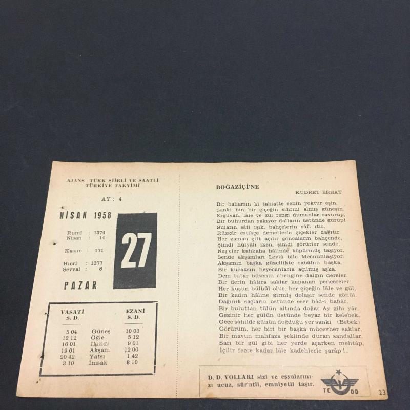 27 NİSAN 1958 -TAKVİM YAPRAĞI-DOĞUM GÜNÜ HEDİYESİ- AJANS-TÜRK ŞİİRLİ VE SAATLİ TÜRKİYE TAKVİMİ,KUDRET ERHAT,BEHÇET NECATİGİL,FAL,FIKRA,GÜZEL SÖZ,YEMEK LİSTESİ, 1 yıl önce satışa sunulmuştur.