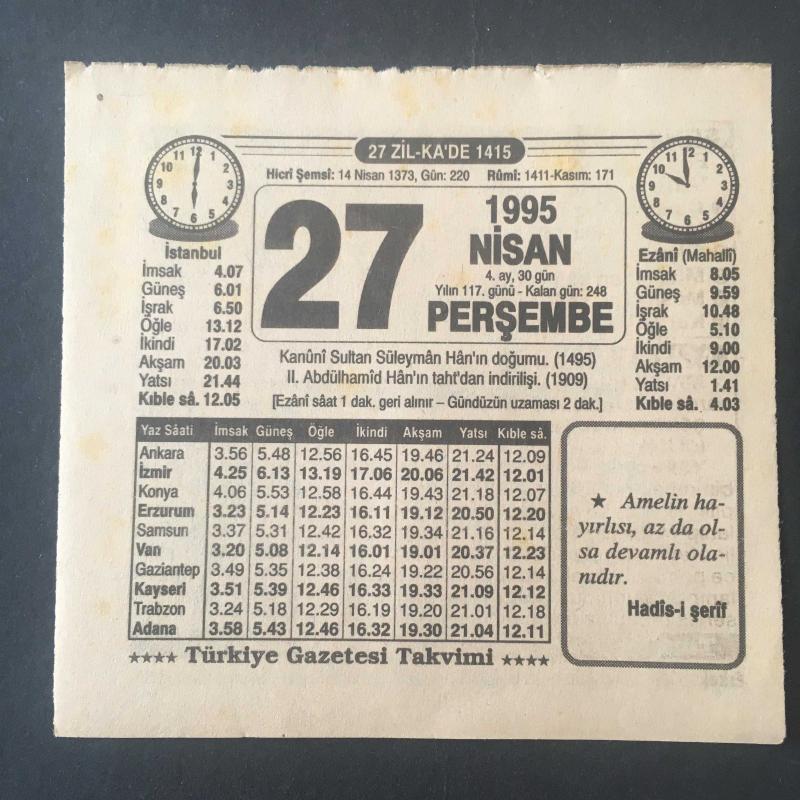 27 NİSAN 1995 -TAKVİM YAPRAĞI-DOĞUM GÜNÜ HEDİYESİ-TÜRKİYE GAZETESİ TAKVİMİ,KANUNİNİN DOĞUMU 1495,2.ABDULHAMİDİN TAHTTAN İNDİRİLİŞİ 1909,ALLAHU TEALANIN SIFATLARI 1,DİL,BİR RİCA, en son 8 ay önce güncellenmiştir.