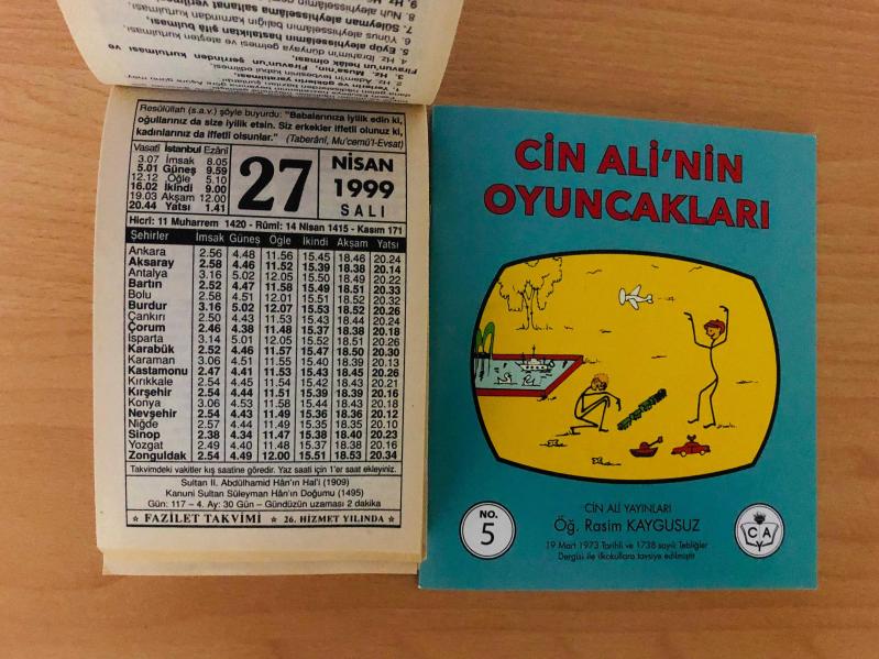 27 Nisan 1999 hediyelik orijinal Fazilet takvim yaprağı (Cin Ali kitabı hediyeli:), en son 7 ay önce güncellenmiştir.