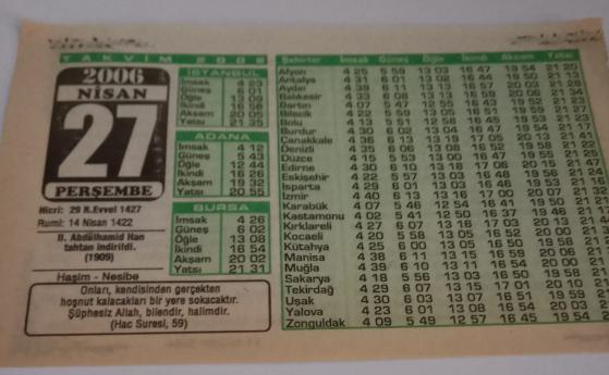 27 Nisan 2006-Orijinal Takvim Yaprağı-Doğum Günü-Söz,Nişan,Nikâh,Düğün ve Önemli Günler Hediyesi-Bizim Anadolu Takvimleri-Ayet-Hadis(Hac Suresi,59)(II.Abdulahmid Han tahtan indirildi)-Haşim,Nesibe-Kanuni Sultan Süleyman, en son 3 ay önce güncellenmiştir.