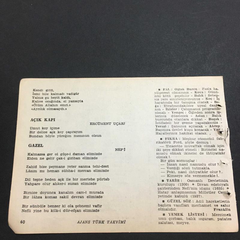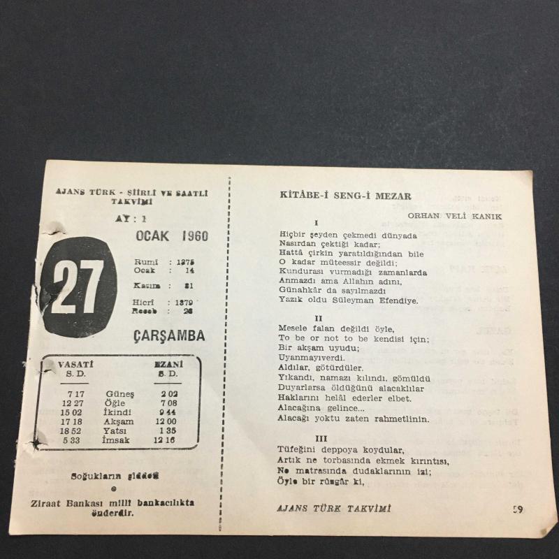 27 OCAK 1960 -TAKVİM YAPRAĞI-DOĞUM GÜNÜ HEDİYESİ-AJANS TÜRK-ŞİİRLİ VE SAATLİ TAKVİMİ,ORHAN VELİ KANIK,ERCÜMENT UÇARI,NEF -İ,FAL,FIKRA,OSMANLI DEVLETİNİN KURULUŞU,1300,NEFİNİN İDAMI,1635,HATAY ANTLAŞMASININ MİLLETLER CEMİYETİNDE KABULÜ,1937,GÜZEL SÖZ,YEMEK LİSTESİ, 1 yıl önce satışa sunulmuştur.
