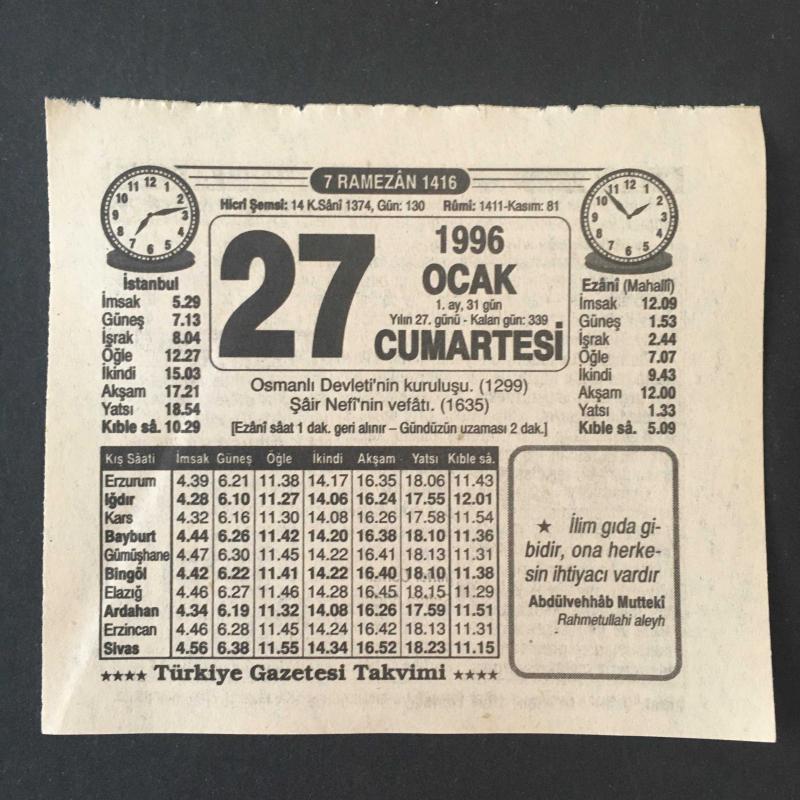 27 OCAK 1996-TAKVİM YAPRAĞI-DOĞUM GÜNÜ HEDİYESİ-TÜRKİYE GAZETESİ TAKVİMİ,OSMANLI DEVLETİNİN KURULUŞU 1299,NEFİ NİN VEFATI 1635,OSMANLI DEVLETİ başlıklı ürün, Efemera, Müzik, Sinema > Belge ve Evraklar > Takvimler kategorisi altında İkinci El olarak satılmaktadır.