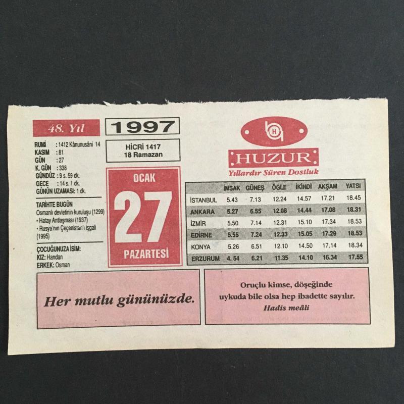 27 OCAK 1997-TAKVİM YAPRAĞI-DOĞUM GÜNÜ HEDİYESİ-HUZUR TAKVİMİ,OSMANLI DEVLETİNİN KURULUŞU 1299,HATAY ANLAŞMASI 1937,RUSLARIN ÇEÇENİSTANI İŞGALİ 1995,ÇOCUĞUNUZA İSİM, OSMANLI DEVLETİNİN KURULUŞU BÜYÜKLERİ SAYMAK, başlıklı ürün, Efemera, Müzik, Sinema > Belge ve Evraklar > Takvimler kategorisi altında İkinci El olarak satılmaktadır.