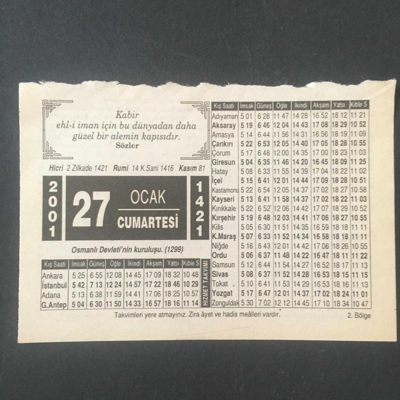 27 OCAK 2001 -TAKVİM YAPRAĞI-DOĞUM GÜNÜ HEDİYESİ-HİZMET TAKVİMİ,OSMANLI DEVLETİNİN KURULUŞU 1299,CENNET BAHÇESİ başlıklı ürün, Efemera, Müzik, Sinema > Belge ve Evraklar > Takvimler kategorisi altında İkinci El olarak satılmaktadır.