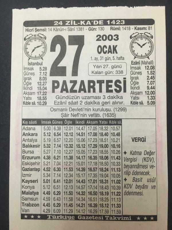 27 OCAK 2003-TAKVİM YAPRAĞI-DOĞUM GÜNÜ HEDİYESİ-TÜRKİYE GAZETESİ TAKVİMİ,OSMANLI DEVLETİNİN KURULUŞU,1299,ŞAİR NEFİ NİN VEFATI 1635,VASİYET Mİ ANAYASA MI, 1 yıl önce satışa sunulmuştur.
