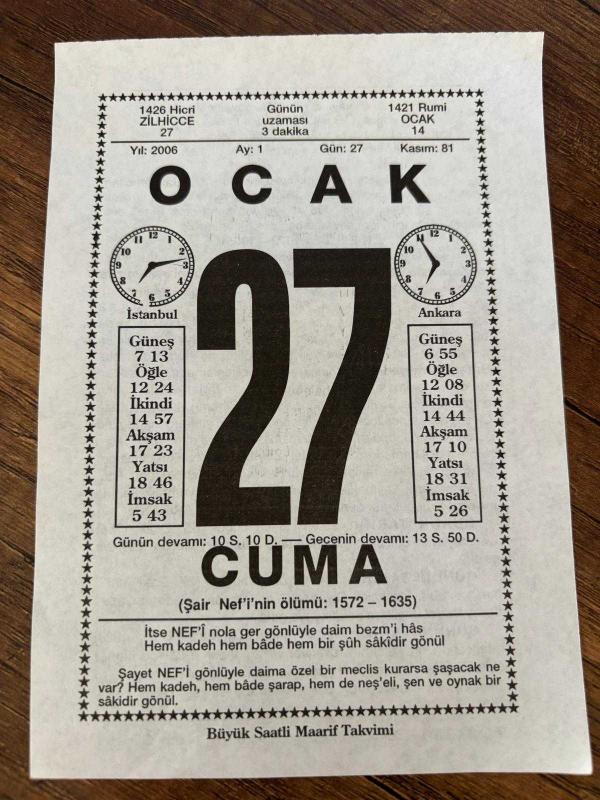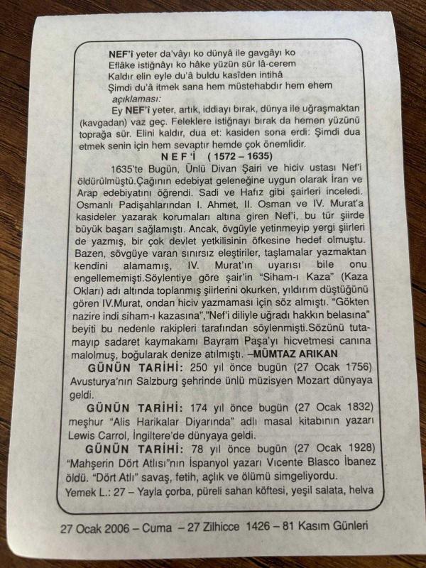 27 OCAK 2006 - TAKVİM YAPRAĞI - DOĞUM GÜNÜ HEDİYESİ - BÜYÜK SAATLİ MAARİF TAKVİMİ - NEF'İ - NEF'İ NİN İDAMI - MÜMTAZ ARIKAN - MOZART DÜNYAYA GELDİ - YAZAR LEWİS CARROL DOĞDU - İSPANYOL YAZAR VICENTE BLASCO İBANEZ ÖLDÜ, 3 ay önce satışa sunulmuştur.