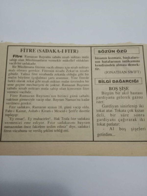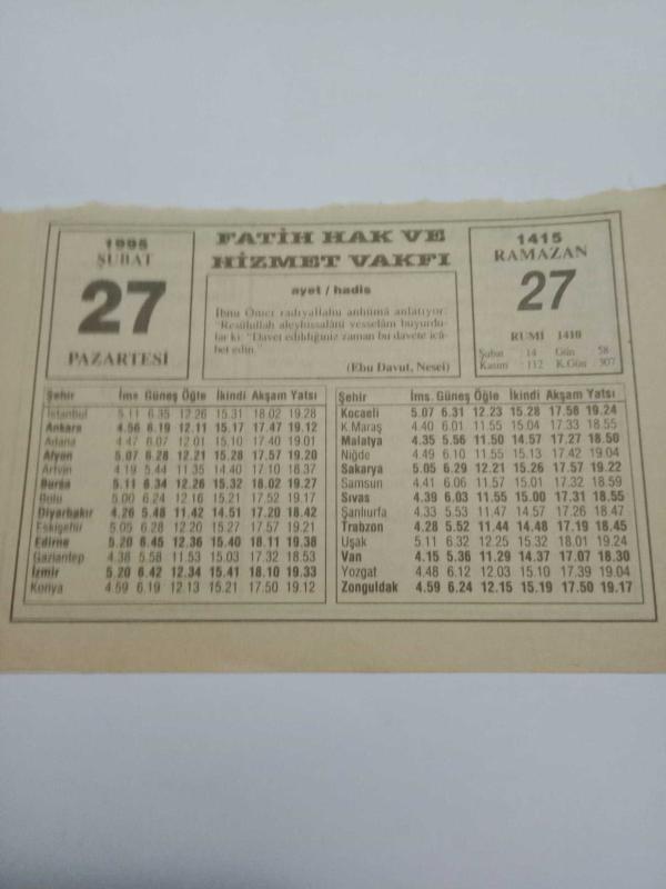 27 Şubat 1995-Orijinal Takvim Yaprağı-Doğum Günü-Söz,Nişan,Nikâh,Düğün ve Önemli Günler Hediyesi-Fatih Hak ve Hizmet Vakfı-Ayet/Hadis(Ebu Davut,Nesei)-Fitre(Sadaka-ı Fıtr)-(Jonathan Swift)-Boş Şişe, en son 5 ay önce güncellenmiştir.