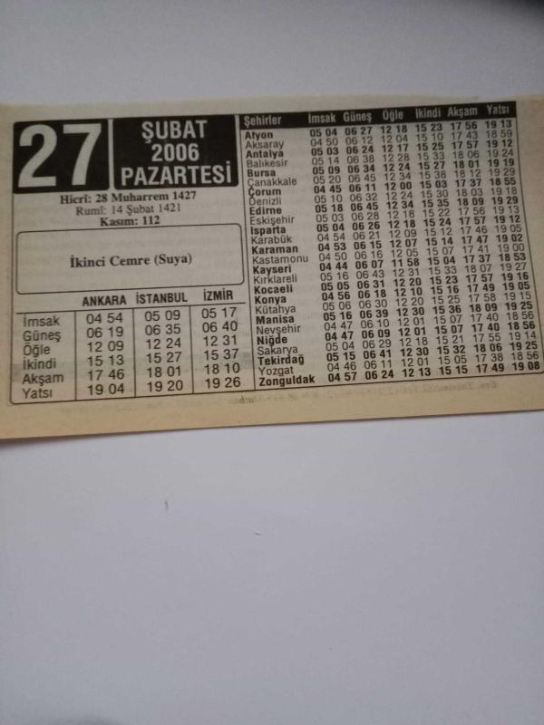 27 Şubat 2006-Orijinal Takvim Yaprağı-Doğum Günü-Söz,Nişan,Nikâh,Düğün ve Önemli Günler Hediyesi-ERAŞ Hizmet Takvimi-Ayet-Hadis(İkinci Cemre (Suya))-Beyin Hücrelerindeki Tahribat Bir Kadeh İçki İle Başlar-Çocuğunuza İsim:Uğur,Ülker, en son 3 ay önce güncellenmiştir.