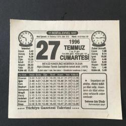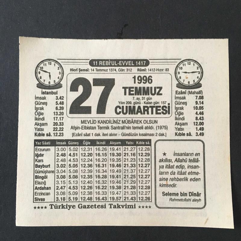 27 TEMMUZ 1996 -TAKVİM YAPRAĞI-DOĞUM GÜNÜ HEDİYESİ-TÜRKİYE GAZETESİ TAKVİMİ,AFŞİN ELBİSTAN TERMİK SANTRALİNİN TEMELİ ATILDI 1975,ONUN DOĞDUĞU GECE,KOŞAN AT,EMİRLERİ KİM VERİR, en son 8 ay önce güncellenmiştir.