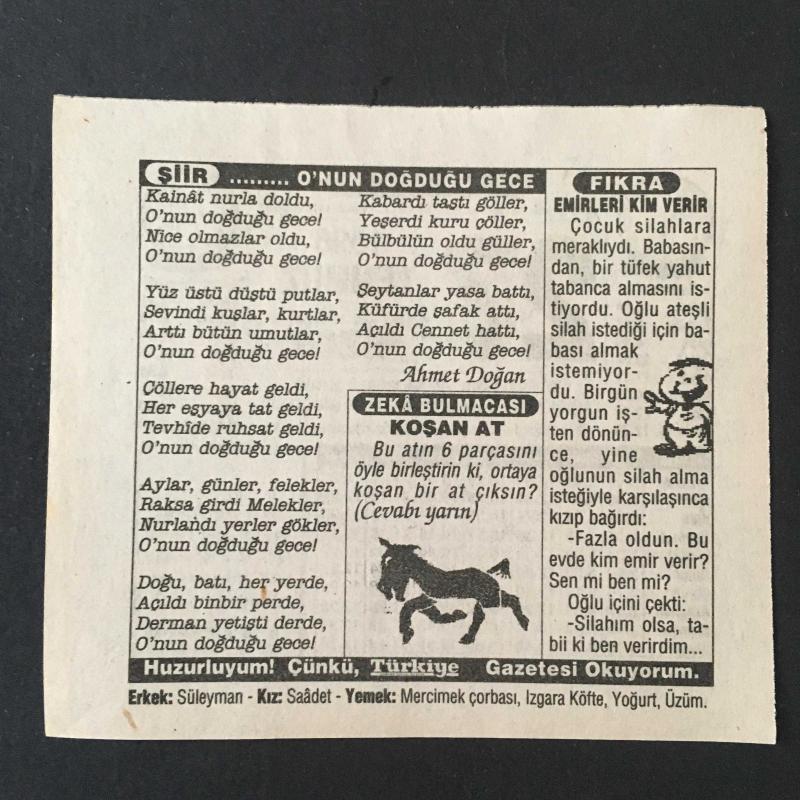 Gazeteler,dergiler,kitaplar harika hediyelerdir.Otantik,orijinal,nadir ve eski gazeteler,dergiler,kitaplar,efemeralar,objeler.Gazeteler bir aynadır.Kitaplar sadece okumak için değil birlikte yaşamak içindir . Kelimeler , notalar , sayılar kardeştirler.Kitaplar insanı binbir gözlü yapar.