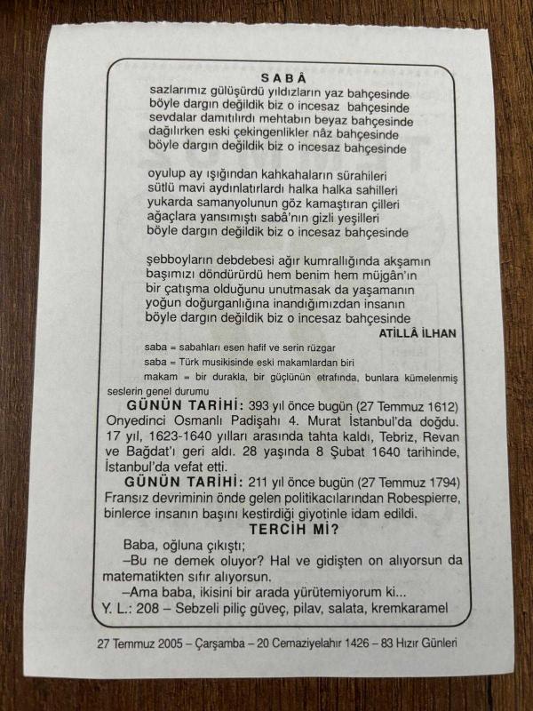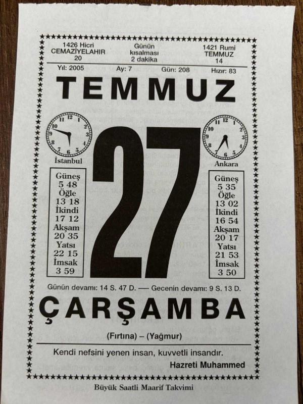 27 TEMMUZ 2005 - TAKVİM YAPRAĞI - DOĞUM GÜNÜ HEDİYESİ - BÜYÜK SAATLİ MAARİF TAKVİMİ - HZ.MUHAMMED - ATİLLA İLHAN - 17.OSMANLI PADİŞAHI 4.MURAT DOĞDU - FRANSIZ POLİTİKACI ROBESPİERRE İDAM EDİLDİ, en son 8 ay önce güncellenmiştir.