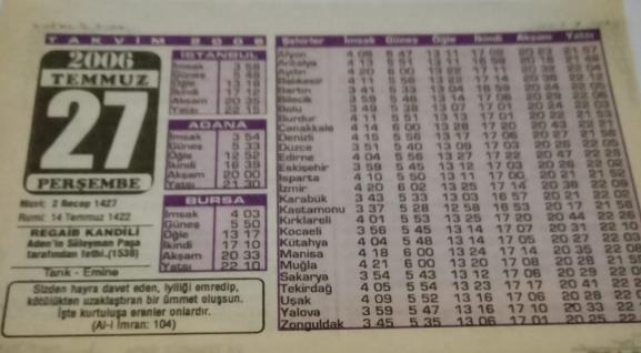 27 Temmuz 2006-Orijinal Takvim Yaprağı-Doğum Günü-Söz,Nişan,Nikâh,Düğün ve Önemli Günler Hediyesi-Bizim Anadolu Takvimleri-Ayet(AI-I Imran: 104)-(Regaib Kandili)-Tarık - Emine-Sigara İçmenin Vücuda Etkileri başlıklı ürün, Efemera, Müzik, Sinema > Belge ve Evraklar > Takvimler kategorisi altında İkinci El olarak satılmaktadır.