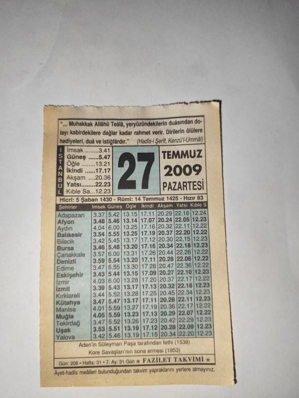 27 Temmuz 2009-Orijinal Takvim Yaprağı-Doğum Günü-Söz,Nişan,Nikâh,Düğün ve Önemli Günler Hediyesi-Fazilet Takvimi-Ayet(Hadis)(Hadis-i Şerif, Kenzü'l-Ummal)-Aden'in Süleyman Paşa tarafından Fethi (1538)-Ana Baba Hakkında Dair başlıklı ürün, Efemera, Müzik, Sinema > Belge ve Evraklar > Takvimler kategorisi altında İkinci El olarak satılmaktadır.