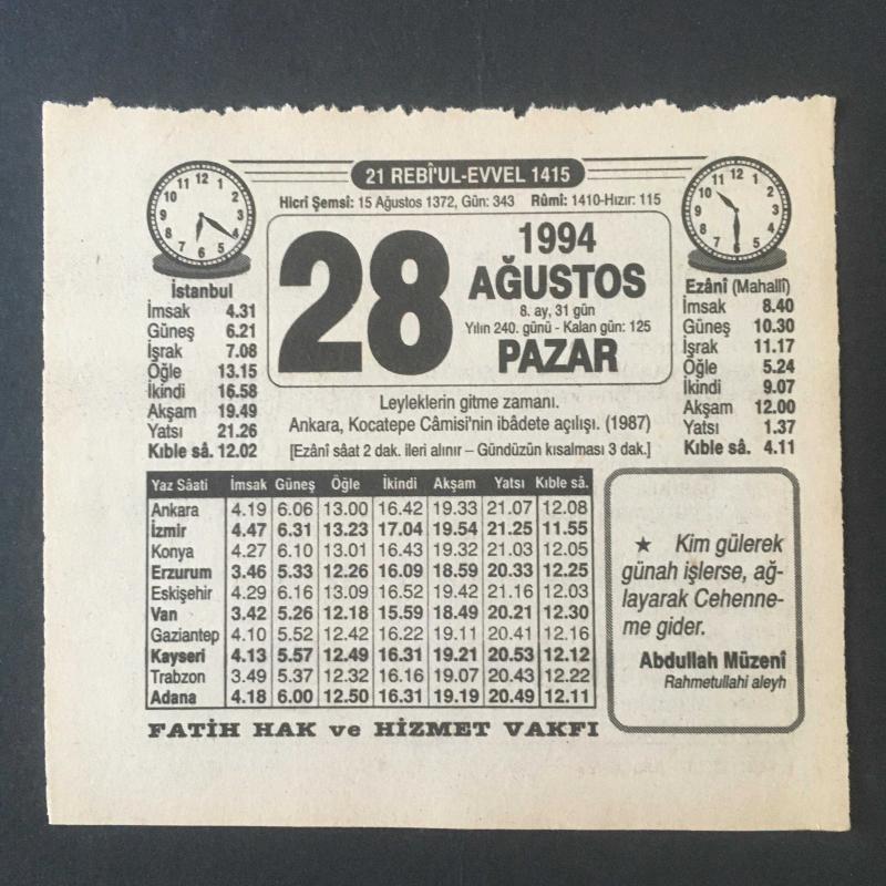 28 AĞUSTOS 1994 -TAKVİM YAPRAĞI-DOĞUM GÜNÜ HEDİYESİ-FATİH HAK VE HİZMET VAKFI TAKVİMİ,LEYLEKLERİN GİTME ZAMANI,ANKARA KOCATEPE CAMİİSİNİN İBADETE AÇILIŞI 1987,MOHAÇ SAVAŞI,BİLMECELER, 1 yıl önce satışa sunulmuştur.