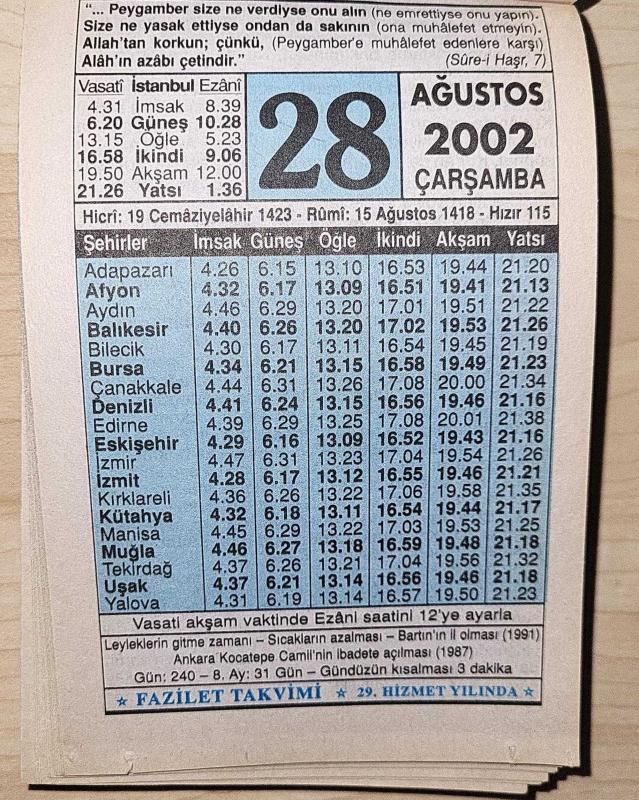 28 AĞUSTOS 2002 ÇARŞAMBA - TAKVİM YAPRAĞI - DOĞUM GÜNÜ HEDİYESİ - FAZİLET TAKVİMİ - BARTIN'IN İL OLMASI (1991)-ANKARA KOCATEPE CAMİİ'NİN İBADETE AÇILMASI (1987)-SÜNNETİN TEŞRİ' KAYNAĞI OLUŞUNU GÖSTEREN HADİSLER başlıklı ürün, Efemera, Müzik, Sinema > Belge ve Evraklar > Takvimler kategorisi altında İkinci El olarak satılmaktadır.