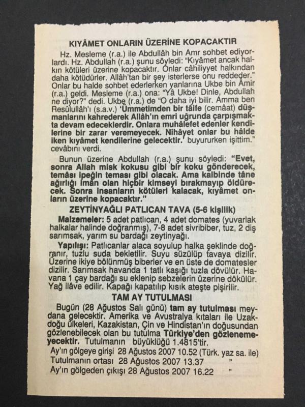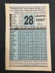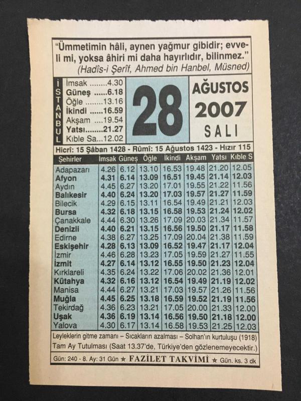 28 AĞUSTOS 2007 -TAKVİM YAPRAĞI-DOĞUM GÜNÜ HEDİYESİ-FAZİLET TAKVİMİ,LEYLEKLERİN GİTME ZAMANI ,SICAKLIKLARIN AZALMASI,SOLHAN IN KURTULUŞU 1918,TAM AY TUTULMASI,KIYAMET ONLARIN ÜZERİNE KOPACAKTIR,ZEYTİNYAĞLI PATLICAN TAVA,, en son 8 ay önce güncellenmiştir.