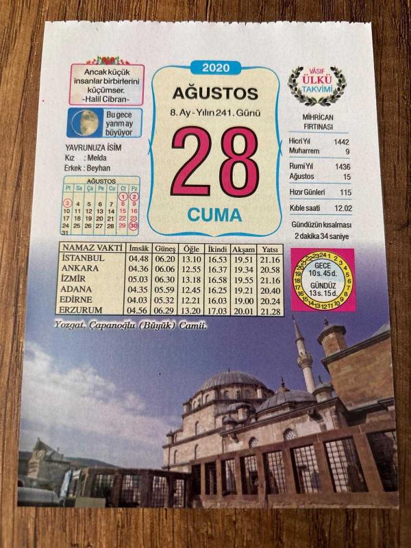 28 AĞUSTOS 2020 - TAKVİM YAPRAĞI - DOĞUM GÜNÜ HEDİYESİ - BÜYÜK SAATLİ MAARİF TAKVİMİ - Yozgat, Çapanoğlu (Büyük) Camii -1918 - Solhan (Bingöl), Rus işgalinden kurtuldu. 1979 - Nesrin Olgun, 15 saat 47 dakikada Manş Denizini yüzerek geçti ve bunu başaran ilk Türk kadını oldu -GREENWİCH SAATİ - BİSKÜVİLİ TOPLAR, 5 ay önce satışa sunulmuştur.