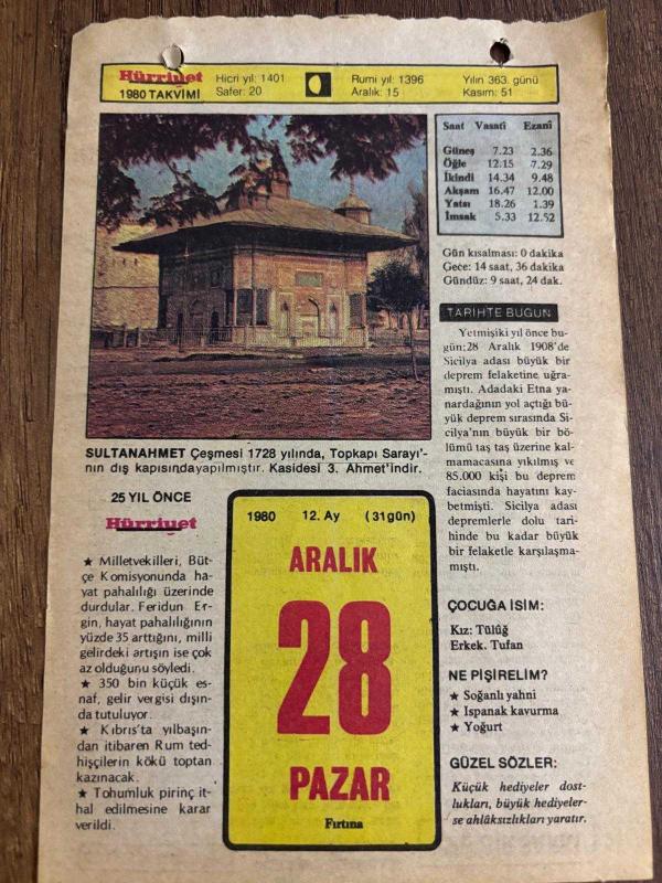 28 ARALIK 1980 - TAKVİM YAPRAĞI - DOĞUM GÜNÜ HEDİYESİ - HÜRRİYET TAKVİMİ - ESKİ BİR ŞARKI ADLI ROMAN - İskenderun Demir-Çelik Tesisleri'nin açılışı (1975) - Romancı Ahmet Mithat Efendi'nin ölümü (1913), 5 ay önce satışa sunulmuştur.