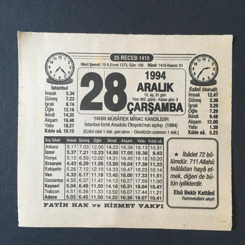 28 ARALIK 1994 -TAKVİM YAPRAĞI-DOĞUM GÜNÜ HEDİYESİ-FATİH HAK VE HİZMET VAKFI TAKVİMİ,İSTANBUL İZMİT ANADOLU OTOYOLUNUN AÇILIŞI 1984,İLK DOLMUŞ,DUYDUNUZ MU, en son 8 ay önce güncellenmiştir.