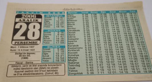 28 Aralık 2006-Orijinal Takvim Yaprağı-Doğum Günü-Söz,Nişan,Nikâh,Düğün ve Önemli Günler Hediyesi-Bizim Anadolu Takvimleri-Ayet(Zuhruf:85)-Sicilya'da deprem 85 bin ölü(1908)-Recai,Berire-Kurban Nasıl Kesilir?-Değerimiz Ne?, en son 2 ay önce güncellenmiştir.