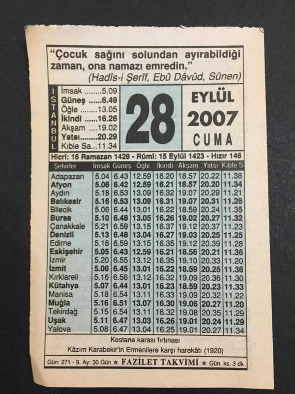28 EYLÜL 2007 -TAKVİM YAPRAĞI-DOĞUM GÜNÜ HEDİYESİ-FAZİLET TAKVİMİ,KESTANE KARASI FIRTINASI,KAZIM KARABEKİR İN ERMENİLERE KARŞI HAREKATI 1920,RAMAZANDA CÖMERTLİK,ZEKATIN VERİLECEĞİ EN GÜZEL YER başlıklı ürün, Efemera, Müzik, Sinema > Belge ve Evraklar > Takvimler kategorisi altında İkinci El olarak satılmaktadır.
