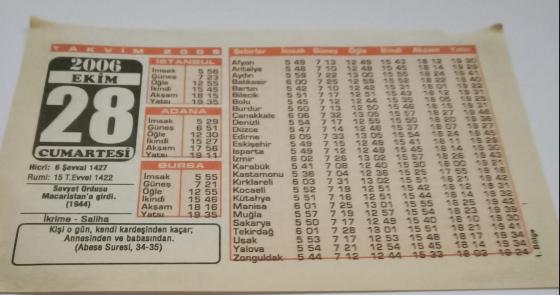 28 Ekim 2006-Orijinal Takvim Yaprağı-Doğum Günü-Söz,Nişan,Nikâh,Düğün ve Önemli Günler Hediyesi-Bizim Anadolu Takvimleri-Ayet(Abese Suresi:34-35)-Sovyet ordusu Macaristan'a Girdi(1944)-İkrime,Saliha-Fısıltı ve Tuğla, en son bir ay önce güncellenmiştir.