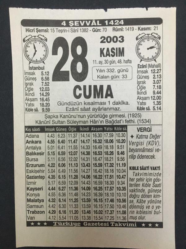28 KASIM 2003-TAKVİM YAPRAĞI-DOĞUM GÜNÜ HEDİYESİ-TÜRKİYE GAZETESİ TAKVİMİ,ŞAPKA KANUNUN YÜRÜRLÜĞE GİRMESİ 1925,KANUNİNİN BAĞDATI FETHİ 1534,SABAH UYKUSU, en son 8 ay önce güncellenmiştir.