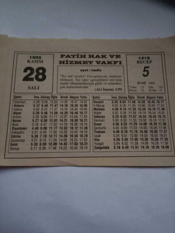 28 Kasım 1995-Orijinal Takvim Yaprağı-Doğum Günü-Söz,Nişan,Nikâh,Düğün ve Önemli Günler Hediyesi-Fatih Hak ve Hizmet Vakfı-Ayet/Hadis(Al-i İmran:139)-Dişeti Çekilmeleri-Sözün Özü-Aşçılar Neden Şapka Takarlar?, en son 4 ay önce güncellenmiştir.