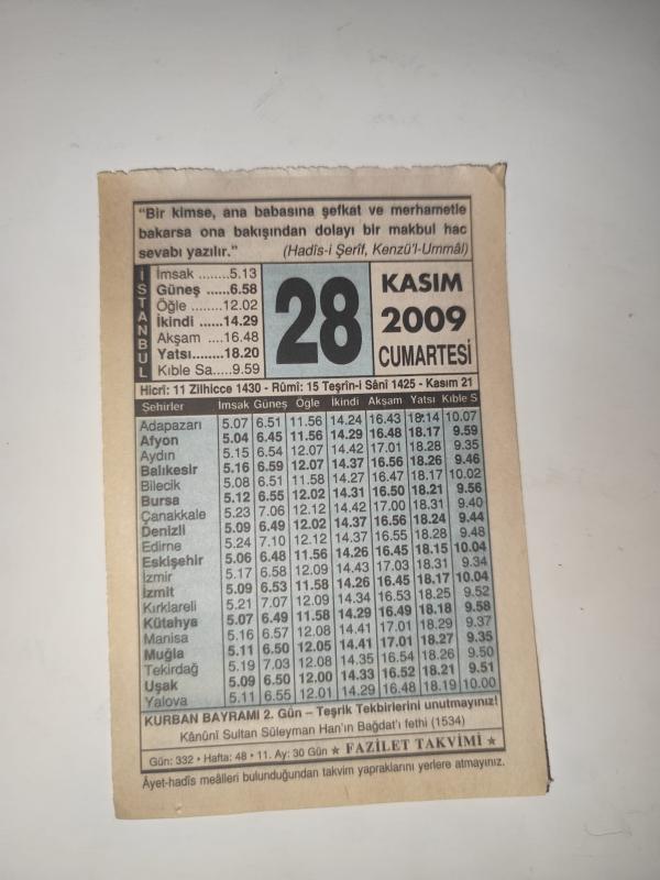 28 Kasım 2009-Orijinal Takvim Yaprağı-Doğum Günü-Söz,Nişan,Nikâh,Düğün ve Önemli Günler Hediyesi-Fazilet Takvimi-Ayet(Hadis)(Hadis-i Şerif, Kenzü'l-Ummal)-Kurban Bayramı 2.Gün, Kanuni Sultan Süleyman Han'ın Bağdat'ı Fethi (1534)-Asım Bin Sabit'in (r.a) Şehid Edilmesi-En Besleyici Gıda, en son 3 gün önce güncellenmiştir.